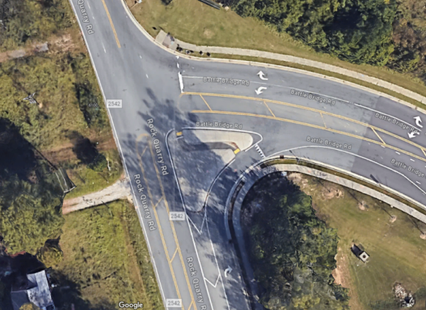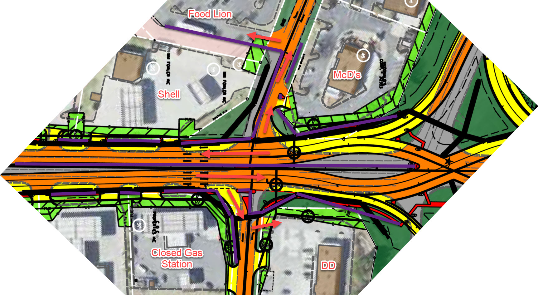 Maybe this will be helpful for the McD's intersection. I tried to clear it up a bit. The purple lines will be concrete dividers, areas which you cannot drive past. The red arrows represent possible paths to drive.