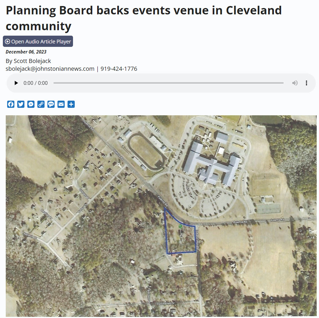 Could it be this? A wedding and events venue could open on the land outlined in blue. Courtesy Johnston County The Johnston County Planning Board on Nov. 21 gave its blessing to a wedding and events venue at Polenta and Indian Camp roads near Cleveland High School. In his application for rezoning, Blake Gotliffe, owner of Under the Oaks Catering in Smithfield, said the project would give new life to Johnston County’s third-oldest home. “The property is very large to maintain as a residence,” he said. “It is also across from the school, making it unappealing as a residence.” Gotliffe said also that preserving the home as an event space would keep something else from going there. “We will prevent an additional small development from being constructed here or an unattractive commercial business,” he said. Johnston County could benefit from another event space, Gotliffe added. “The growing area needs a higher-end wedding venue that provides jobs and keeps money in Johnston County,” he said. Just one neighbor had questions about the project. With an event space as a next-door neighbor, Terry Click said he wanted to make sure he could still mow his yard when he wanted to, and he worried about oil and other fluids leaking from cars parked at the venue. “I’m concerned about the runoff from the vehicles because I’ve got a shallow well that’s about 60 feet from the property,” Click said. Planning Board Chairman Will Letchworth said runoff to his property would not be a problem. The parking lot, he noted, will move to another part of the property, away from his land. Click also wondered about noise from the venue, and again, Letchworth reassured him, noting that the venue would close no later than 11 p.m. “And when that says 11 p.m., it does mean everything done at 11 p.m.” Letchworth said. “Not, all right the party’s over at 11, and staff are finishing it. It means 11 p.m.” Also, the county’s noise ordinance will protect him, Letchworth said. “So if there ever are any issues from a noise ordinance standpoint, it could end up in revoking their special-use permit,” he said. “Then they couldn’t do business anymore.” Gotliffe said he planned to add a 5,000-square-foot ballroom to the house, along with a patio. “We plan to keep it just as beautiful as it is now, make it prettier actually,” he said. The Planning Board was unanimous in supporting the rezoning request. County Commissioners will have the final say.