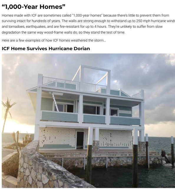 ICF built homes are also very interesting, and because of their documented resistance to Category 5 hurricanes, would present a strong selling point, especially here in the South.