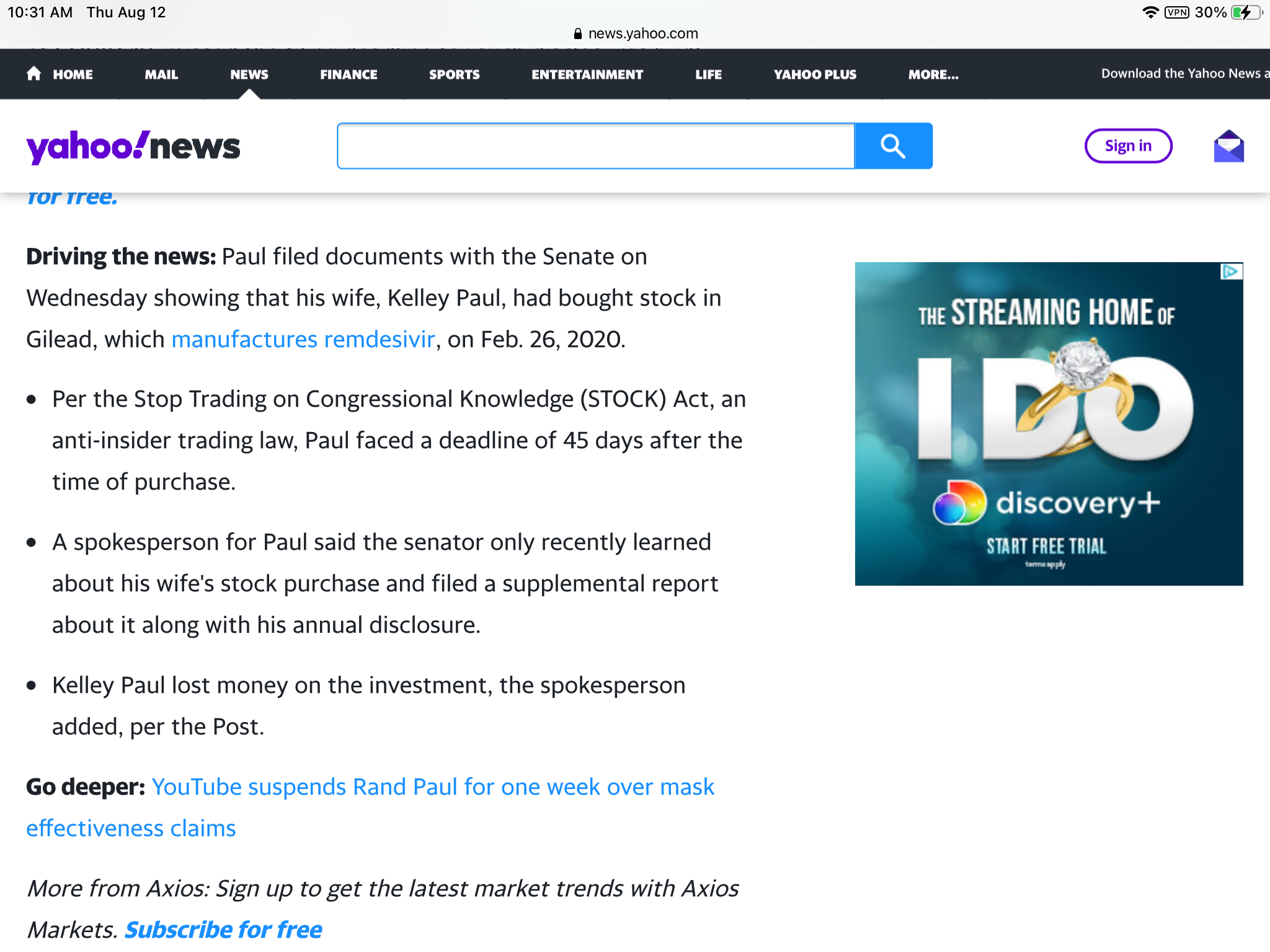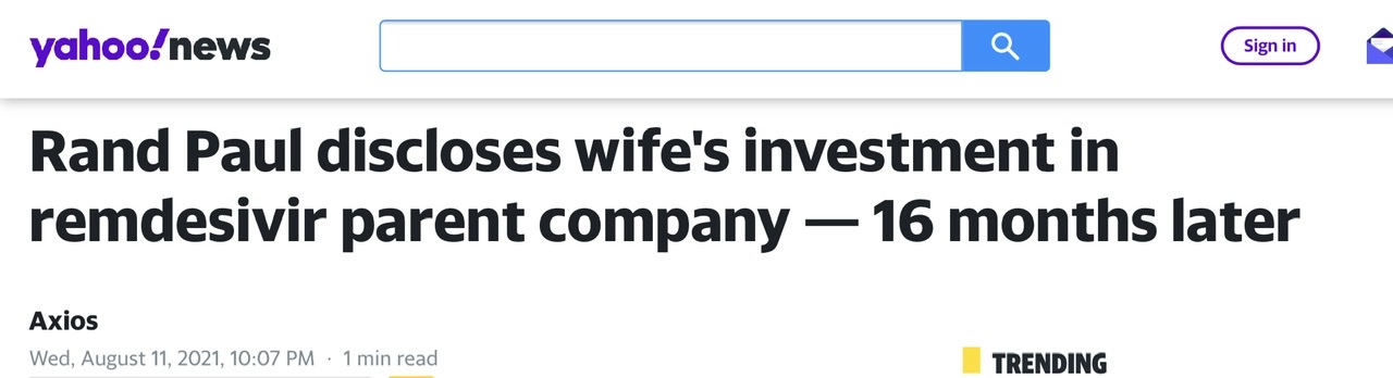 Interesting news today regarding Rand Paul’s wife, Kelly, who invested in Remdesivir, an early Covid treatment product, produced by Gilead Sciences, which proved ineffective to prevent or cure Covid. (Just ONE vial of Remdesivir cost $520, while the rest of the so-called “treatment” cost $3100.) Kelly Rand invested in Remdesivir in February 2020, long before the American public knew much about Covid, which later happened in mid-March 2020. For 16 MONTHS Rand Paul kicked the can down the road before disclosing of this investment, after it finally became necessary for him to do so. Today, Rand Paul is disavowing any prior knowledge of his wife’s investment, while having spent MONTHS discouraging Americans from getting an effective, and FREE vaccine. The silver lining to all of this may be the fact that Kelly Paul lost money on their Remdesivir investment, which is always so nice to hear when people try to cynically profit over the illness and death of other Americans.
