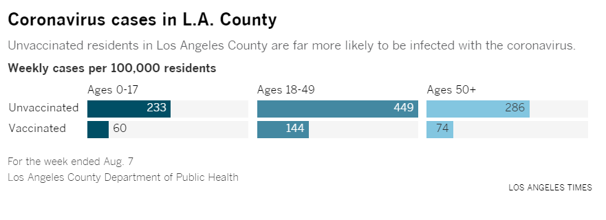 Cumulatively, among 5.1 million L.A. County residents who are fully vaccinated, 0.53% have tested positive, 0.014% have been hospitalized and 0.0013% — or 68 people — have died.[...] That means unvaccinated younger adults are three times as likely to get infected with the coronavirus as their fully vaccinated counterparts. Those being hospitalized, however, are far more likely to be older, unvaccinated adults. The hospitalization rate among unvaccinated adults 50 and older has risen to a new summertime high: For every 100,000 unvaccinated older adults, nearly 60 were in the hospital with a COVID-19 infection. But for every 100,000 fully vaccinated older adults, only five were in the hospital with a COVID-19 infection. That means unvaccinated older adults are 12 times more likely to be hospitalized than their vaccinated counterparts. Unvaccinated younger adults are 25 times more likely to be hospitalized than those who are fully vaccinated in that age group.