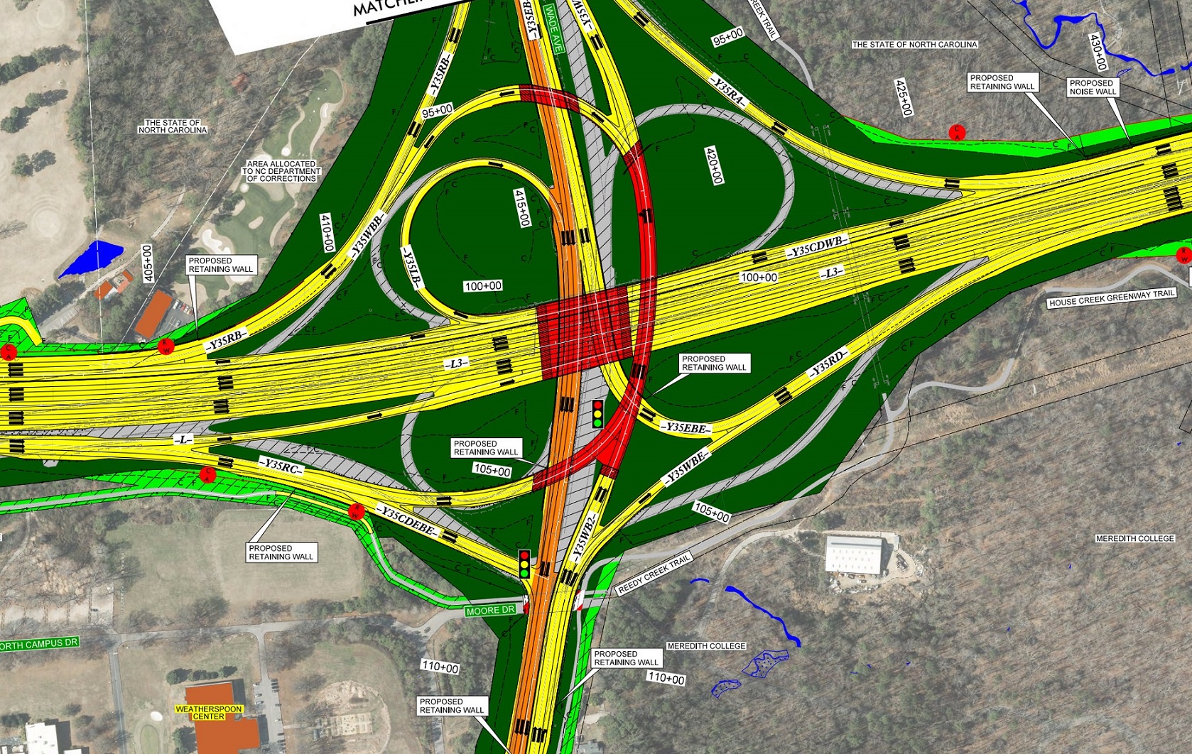 One thing that has confused me so far. At I-40, just south of the US70 onramps, they have constructed the start to 3 different overpasses. But the comstruction drawings on the NC DOT page only show 2 overpasses.