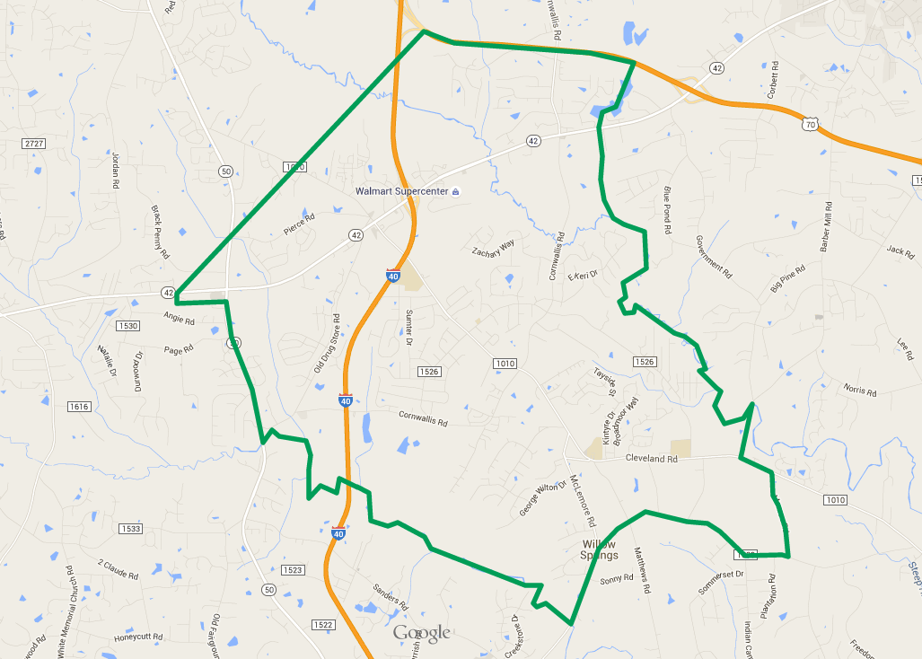 IMO, you need to include all of the 40/42 area up to Swift Creek, everything on 42 up to and including Cornwallis or White Oak Creek (future development will be in those areas), and hopefully everything at the 42/50 intersection. That would give you a large commercial tax base to start with. Any residential areas can or cannot be included based on other discussions, however I do think that most of the areas along Cleveland Road up to at least Barber Mill Road. But in the beginning, it needs to start small, and I think the 40/42 area and along Cleveland to Polenta is probably a good start.
